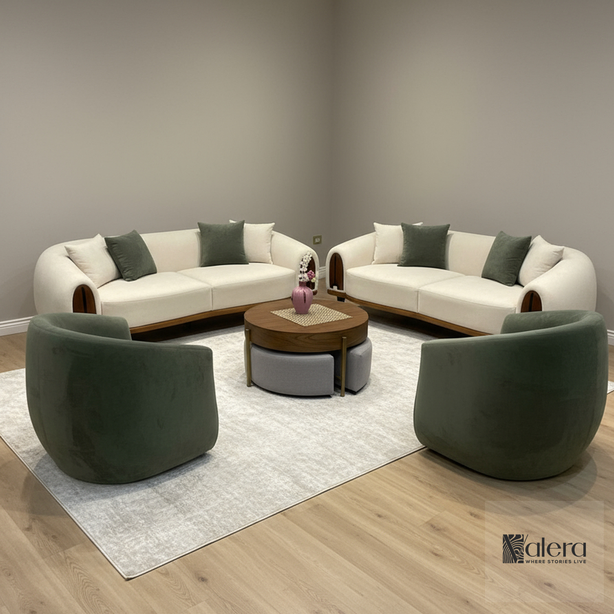 انتريه Valera يجمع بين الراحة والأناقة: كنب منحنٍ بتنجيد ناعم يبرز شكل الظهر، قاعدة خشبية طبيعية تعطي ثباتًا ومتانة، مع كرسيين مخمل بلون أخضر هادئ يضيف لمسة فخامة، وترابيزة قهوة دائرية عملية ببوف سفلي للتخزين أو الجلوس الإضافي. خامات عالية الجودة، تفصيل دقيق للحواف، وألوان متناسقة تناسب الديكورات المودرن والسكندينافية.